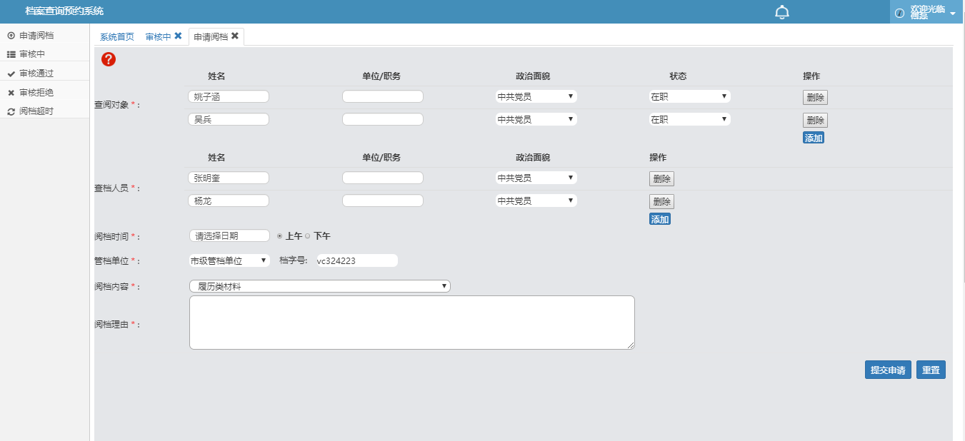 不同權限的申請(qǐng)人(rén)員登錄系統後,再申請(qǐng)閱檔界面填寫對應的查閱對象信息、查檔人(rén)員信息、需要閱讀的材料編号及原因進行(xíng)提交閱檔申請(qǐng),查閱對象、查檔對象可(kě)根據自身情況填寫多(duō)個(gè)。