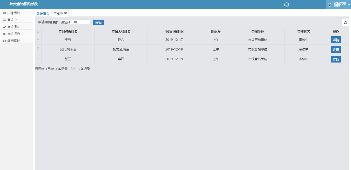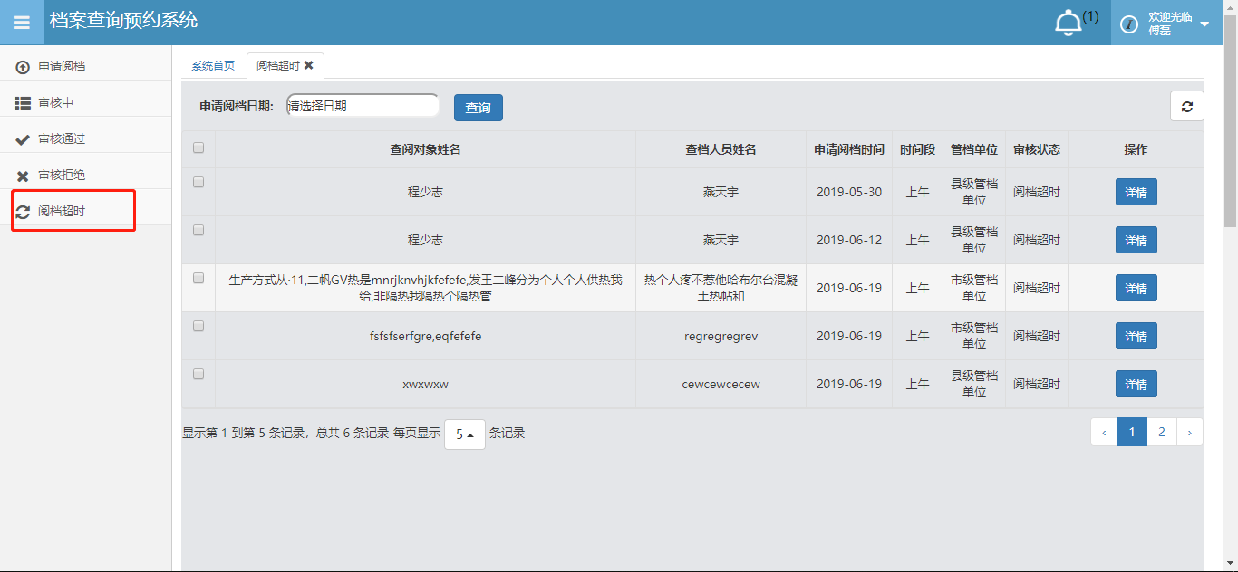 閱檔超時(shí)菜單顯示的是用戶提交的閱檔申請(qǐng)審核通(tōng)過後,如若沒有(yǒu)按時(shí)前往查閱地點進行(xíng)查閱,或查閱後沒有(yǒu)及時(shí)在系統确認的申請(qǐng)單。