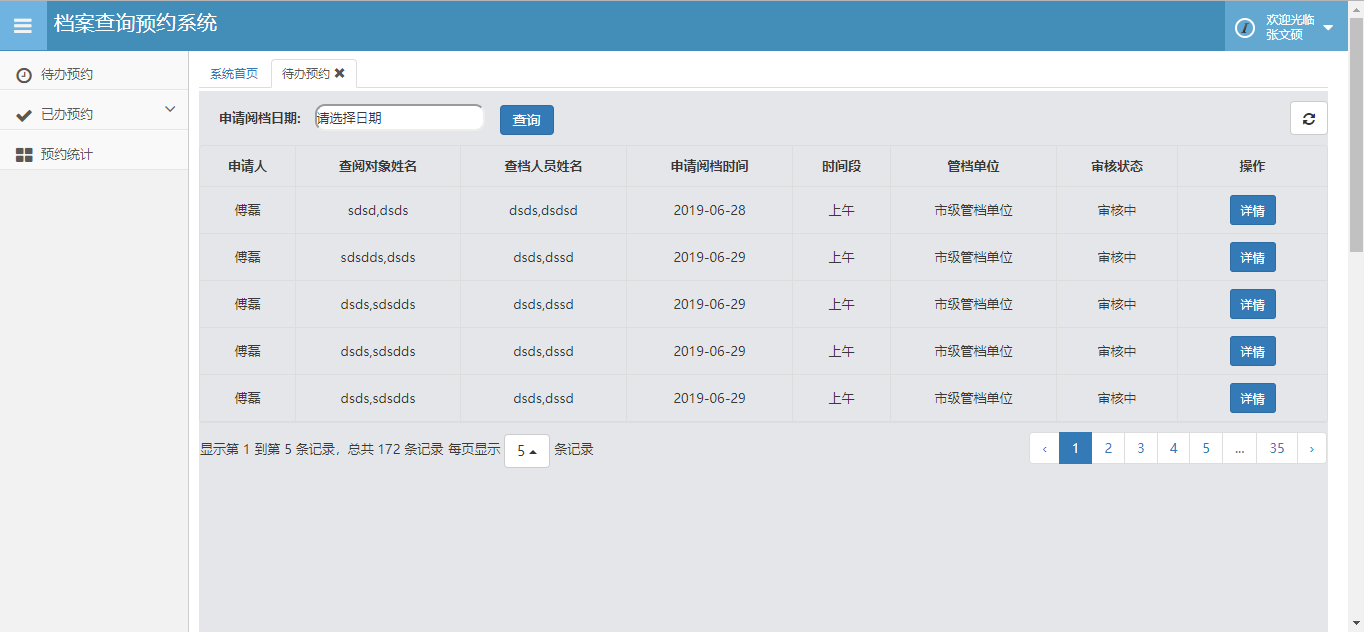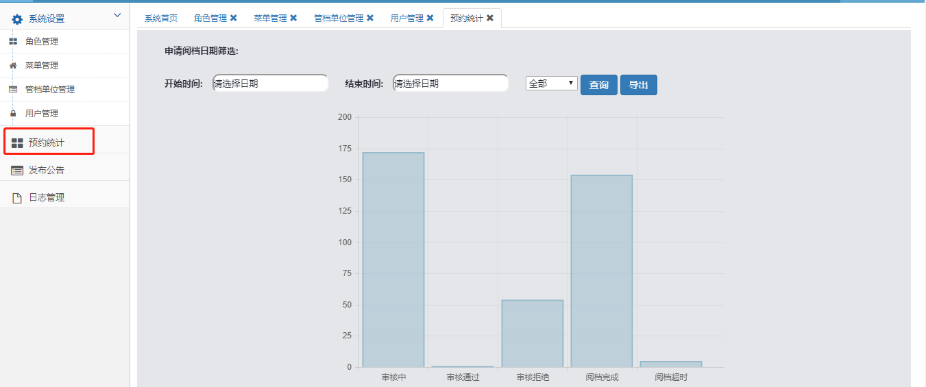 預約人(rén)員提交的所有(yǒu)申請(qǐng)單都會(huì)在預約統計(jì)菜單中展示,檔案管理(lǐ)員可(kě)以随時(shí)查看申請(qǐng)單明(míng)細及狀态,預約申請(qǐng)單的狀态以統計(jì)圖的形式直觀地展示出本年度共申請(qǐng)閱檔次數(shù),通(tōng)過次數(shù),拒絕次數(shù)等信息。用戶可(kě)以按日期,月份,審核狀态等條件篩選查詢。