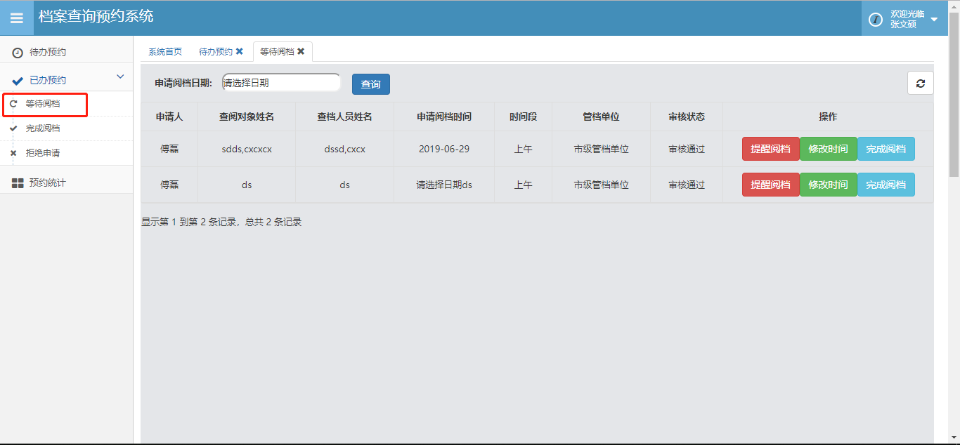 檔案管理(lǐ)員審核通(tōng)過後,預約人(rén)員還(hái)未閱檔的申請(qǐng)單展示在等待閱檔菜單。檔案管理(lǐ)員可(kě)以推送APP消息或短(duǎn)信通(tōng)知提醒預約人(rén)員前來(lái)閱檔;如果時(shí)間(jiān)沖突,也可(kě)以修改閱檔時(shí)間(jiān);當預約人(rén)員閱檔完成後,檔案管理(lǐ)員可(kě)以點擊完成閱檔按鈕,申請(qǐng)單處理(lǐ)完成并歸檔。