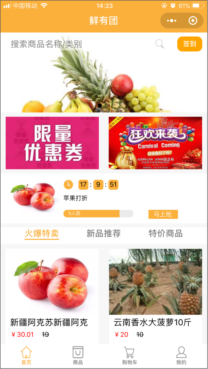 鮮有(yǒu)團小(xiǎo)程序憑借微信群和(hé)朋友(yǒu)圈強大(dà)的分發能力,可(kě)以快速實現推廣運營,并招募社區(qū)團長,商家(jiā)在平台發布生(shēng)鮮水(shuǐ)果、奶蛋魚肉等日常生(shēng)活所需各種商品,用戶可(kě)以在線浏覽商品詳情信息,選擇中意的商品後下單,依靠同城配送速度快的優勢,保證下單後半日送達,減少(shǎo)網購等待時(shí)長,減少(shǎo)超市購物出門(mén)和(hé)排隊結算(suàn)時(shí)長,而且平台不定時(shí)推出折扣、秒(miǎo)殺等活動,鮮有(yǒu)團确實是一款操作(zuò)簡單、方便快捷的社區(qū)團購小(xiǎo)程序。